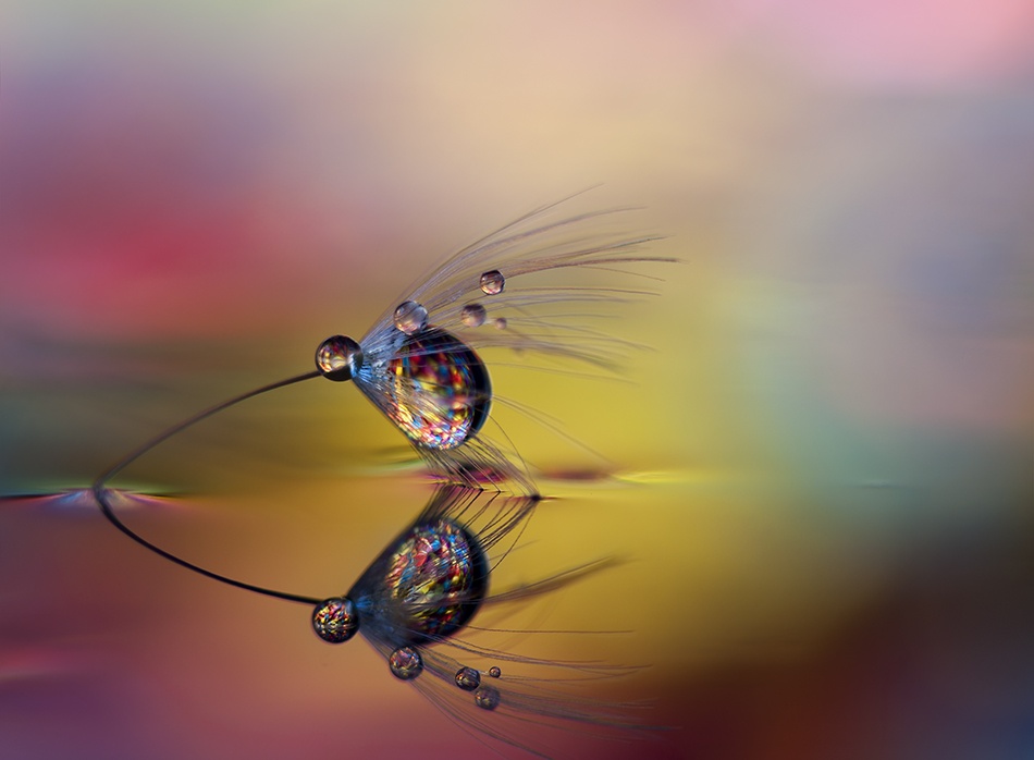 There is a seed of dandelion which is in water, and with a lot of coloured paper behind and was placed in front of a window with sunlight reflected in the water