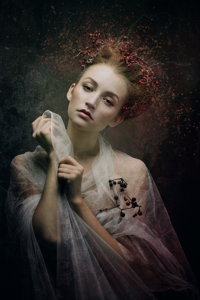 I start of with a careful skin “treatment”. This gives me the possibility of a slow approach, of getting to know the heart of the picture. After that I look for a background, a texture, or sometimes even 10 overlaying textures, depending on the creative idea or process. I'm looking for Flaires, Patterns, Overlays and Bokeh’s. I have a huge library of them. This can easily take hours. When everything is done, I give the whole picture a colour look, that fits, so all the parts harmoniously join in one arrangement.