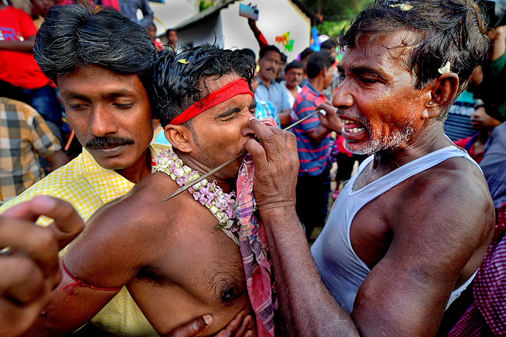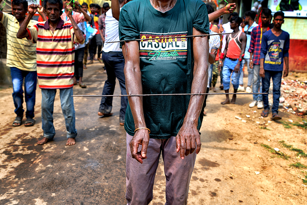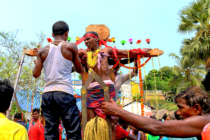 This photo story has been made during the celebration of the Gajan festival in a remote village of Hooghly district of West Bengal. The unique features of this celebration is that here villagers pierce iron rod in their body, tongue and crucify themselves by laying down on wooden framework with huge nails fixed on it.