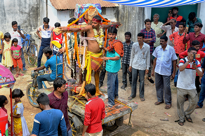 After morning rituals are over, there is a gap for about two hours. The preparation for the crucifying rituals starts around 9 AM. Some devotees lay down on a wooden framework with large numbers of nails fixed on it. Some lay down on a wooden frame having many sharp iron blades. Some experienced people are fixing nails on the Sannasis body and tie them with a cloth to the wooden cross. This is called crucifixion. Sannasis, who are laid down on nail fixed wooden frames or crucified on wooden frames are put on cycle vans.
