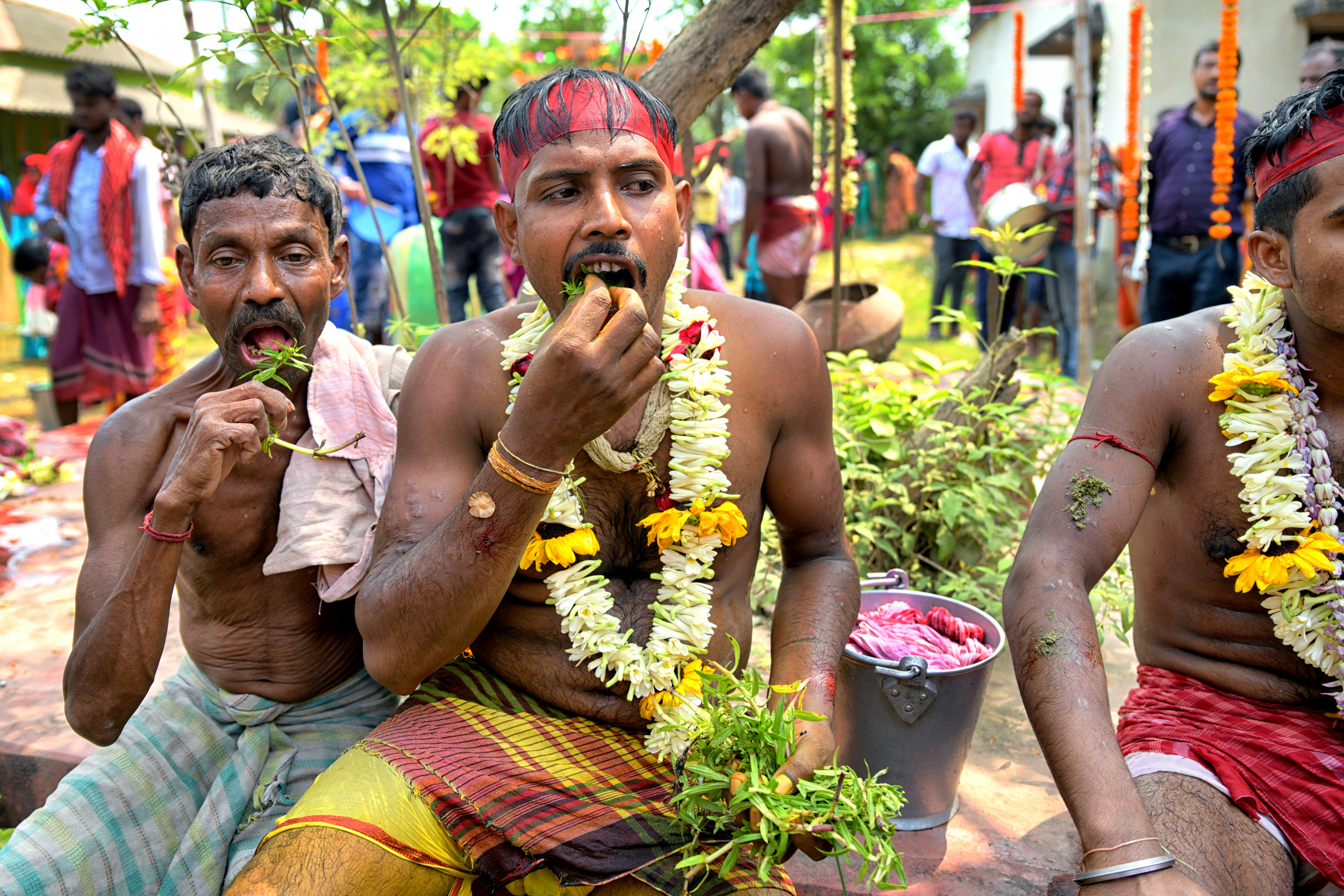 All Sannasir are in bare bodies, wearing only small langot, as Indian village wrestlers wear during wrestling. After reaching their original destination, the devotees slowly start removing the iron rods from their mouth and body. This time faint traces of blood are noticed in their mouth and body. Surprisingly, they don’t use any antiseptic or any medicine on their injuries. Immediately after removal of the iron rods, they are provided with some leaves which they put into their mouth. The leaves are locally known as ‘Kala Puspa’. It is used to stop bleeding and reducing pain and it works like magic. It is known that injuries are cured within two three days. The morning ritual is finished after they removed the iron rods.