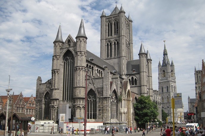 He writes: "St. Nicholas' Church (Dutch: Sint-Niklaaskerk) is one of the oldest and most prominent landmarks in Ghent, Belgium. Begun in the early 13th century as a replacement for an earlier Romanesque church, construction continued through the rest of the century in the local Scheldt Gothic style (named after the nearby river). Typical of this style is the use of blue-gray stone from the Tournai area, the single large tower above the crossing, and the slender turrets at the building's corners. Built in the old trade center of Ghent next to the bustling Korenmarkt, St. Nicholas' Church was popular with the guilds whose members carried out their business nearby. The guilds had their own chapels which were added to the sides of the church in the 14th and 15th centuries. The central tower, which was funded in part by the city, served as an observation post and carried the town bells until the neighboring belfry of Ghent was built. …)."