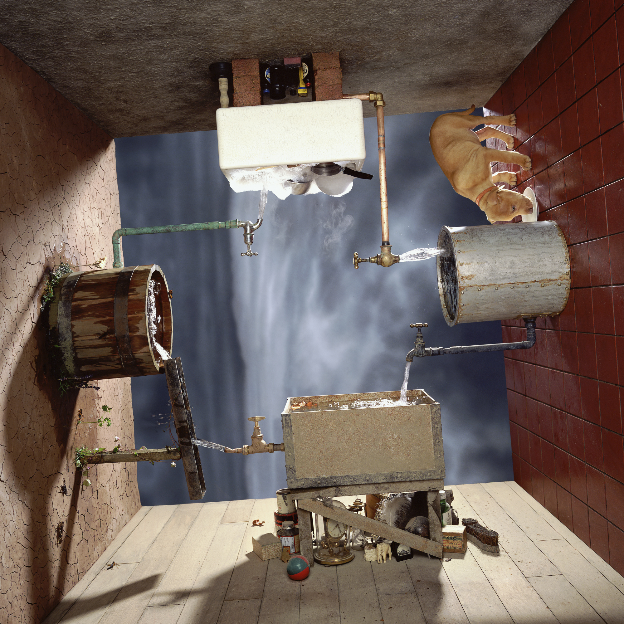 Of course not all images are the same. Each project has its own requirements. “Dinner with Dali” didn’t require any tech at all. The background was painted, the dinner set was rigged on armatures and the lightly coloured water was blown out of the glass from a tube welded into the back of the glass and fed through the background painting. I simply blew through the tube to force the water out of the glass and fired the shutter by hand judging the right moment by eye.