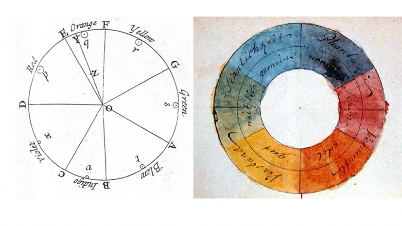 Newton's colour wheel on the left, Goethe's on the righthttps://annrichmanart.com/blog/goethes-color-theory