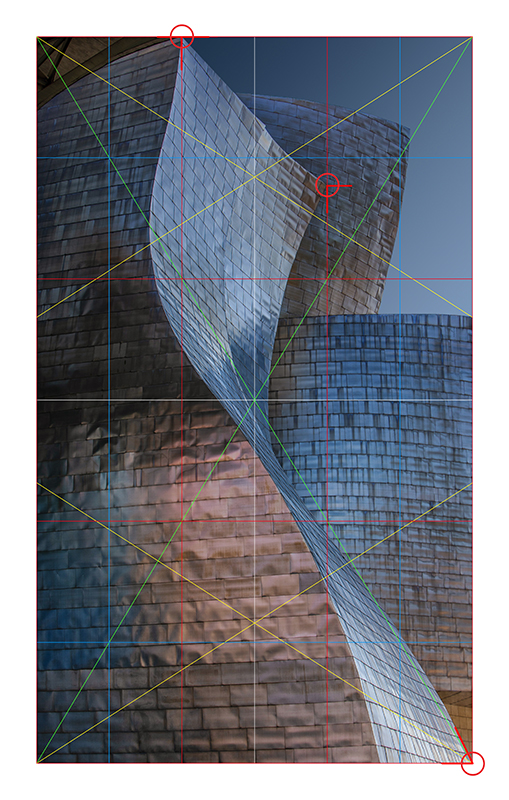 This image perfectly illustrates what I was explaining earlier: knowing when to take a shot (in this case, when the reflections created an interesting texture) and using one of my proportional grids to compose the photo down to the last pixel.